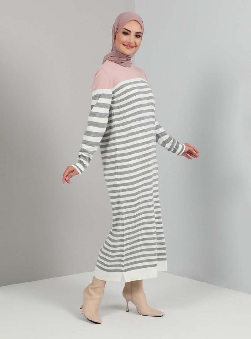 Tavin Gri Bisiklet Yaka Omuzda Renk Detaylı Çizgili Triko Elbise