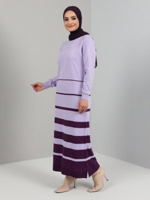 Tavin Lila Bisiklet Yaka Çizgi Detaylı Triko Elbise