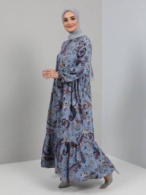 Tavin Mavi Şal Desenli Doğal Kumaşlı Elbise