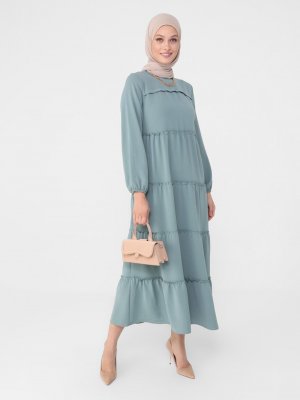Refka Koyu Çağla Balon Kollu Salaş Elbise