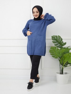 SAHRA BUTİK İndigo Cepli Balon Kollu Triko Tunik