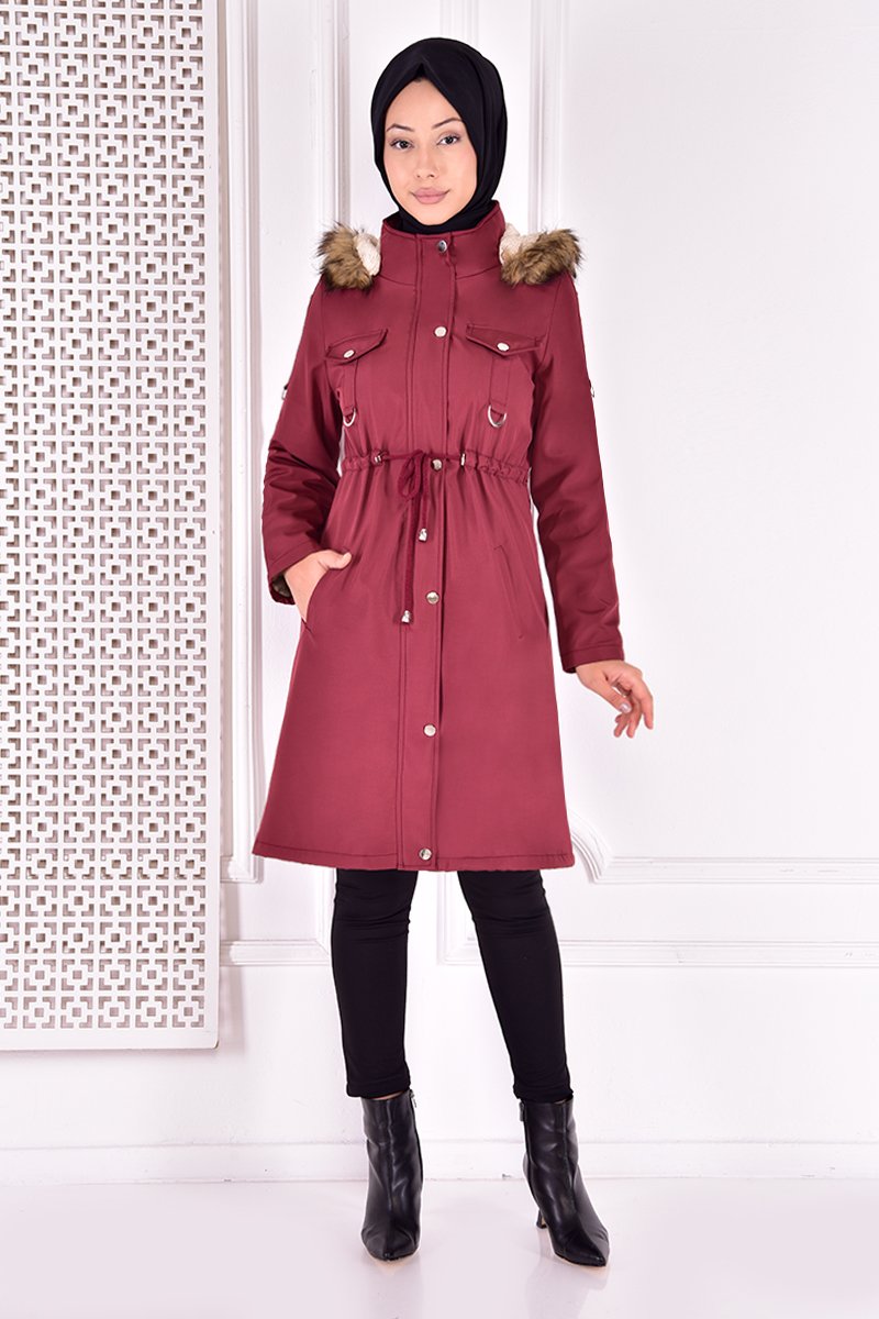 Moda Merve Kapüşonlu Kaban Bordo