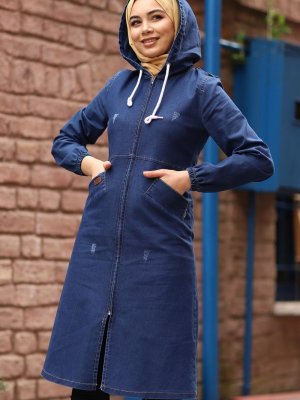 In Style Kapüşonlu Eskitme Mavi Kot Ceket