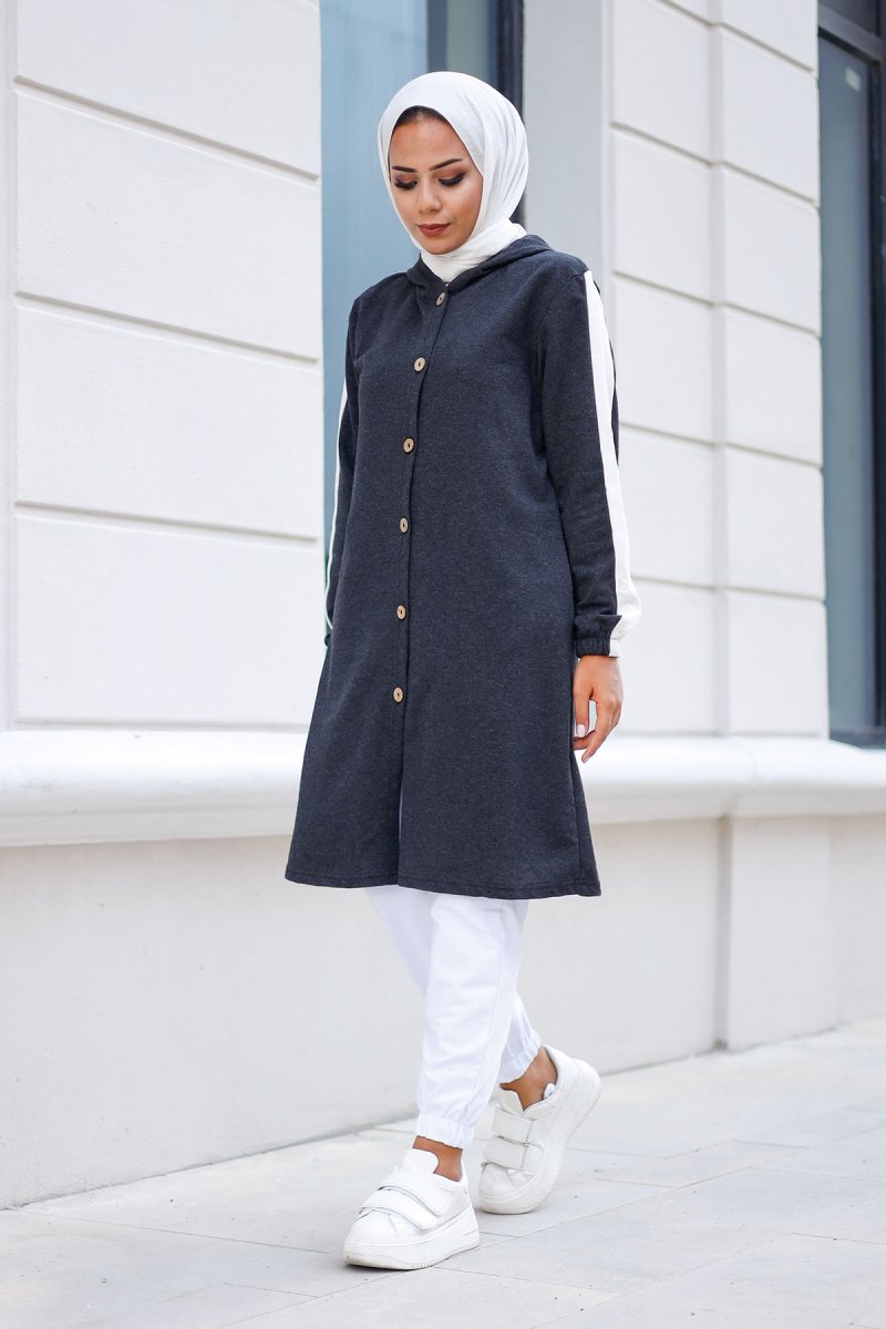 In Style Antrasit Düğmeli İki İplik Kapüşonlu Kap