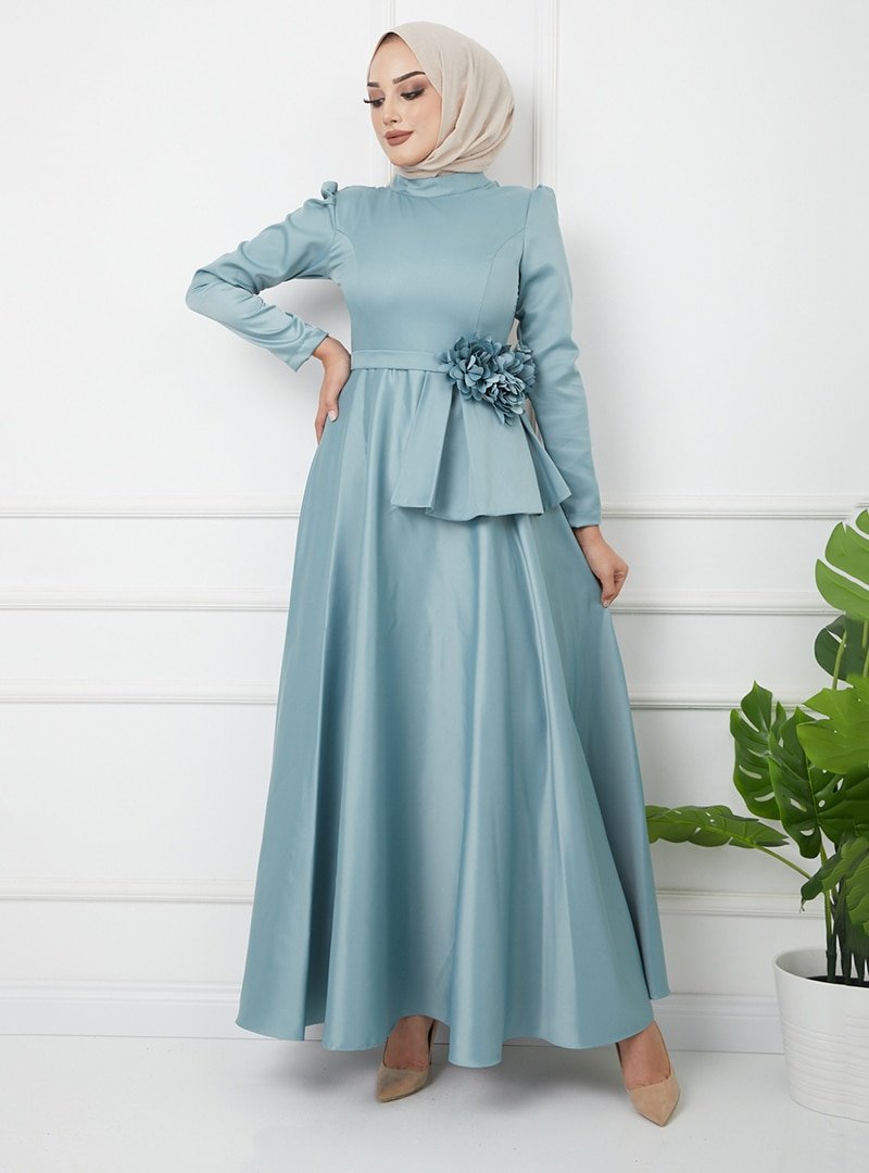 Olcay Mint Çiçek Detaylı Beli Volanlı Saten Abiye Elbise