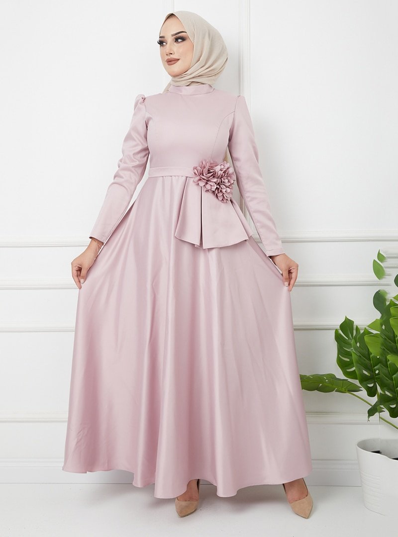 Olcay Pudra Çiçek Detaylı Beli Volanlı Saten Abiye Elbise