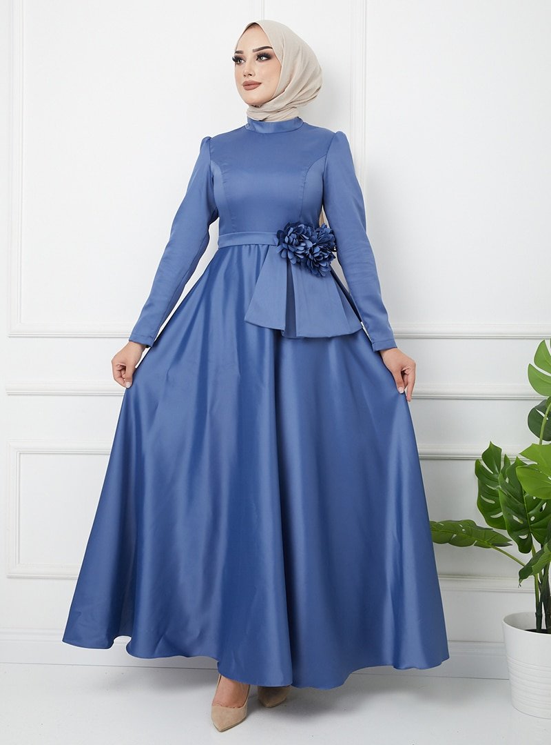 Olcay İndigo Çiçek Detaylı Beli Volanlı Saten Abiye Elbise