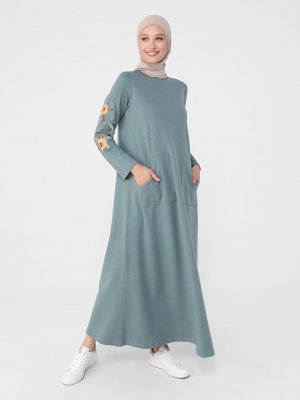 Refka Koyu Çağla Kolları Nakış Detaylı Elbise