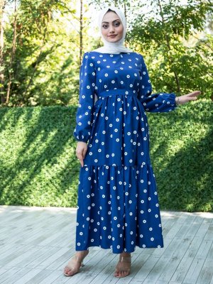 Sevit-Li Lacivert Çiçek Desenli Elbise