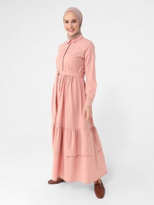 Refka Gül Kurusu Kendi Kumaşından Kemerli Eteği Katlı Doğal Kumaşlı Elbise