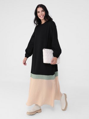 Alia Siyah Haki Bej Büyük Beden Renk Bloklu Elbise