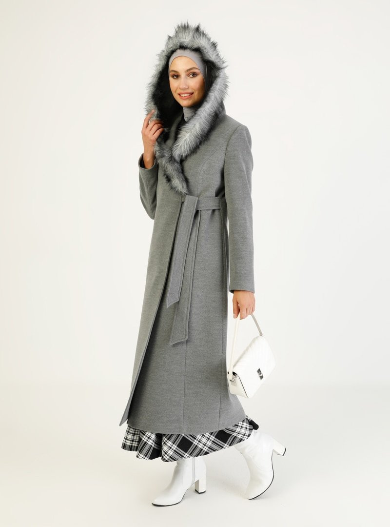 Concept By Olcay Gri Kapüşonu Kürk Detaylı Kaban
