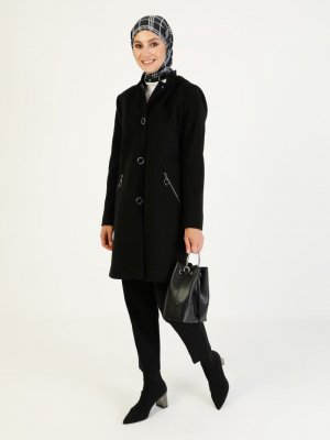 Olcay Siyah Kapüşonlu Çıtçıt Detaylı Kaban