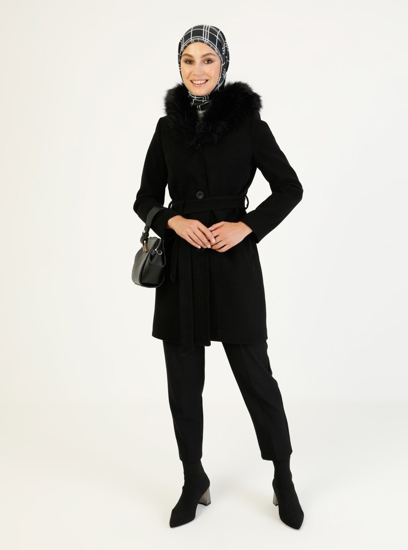 Concept By Olcay Siyah Kapüşonu Kürk Detaylı Kaban