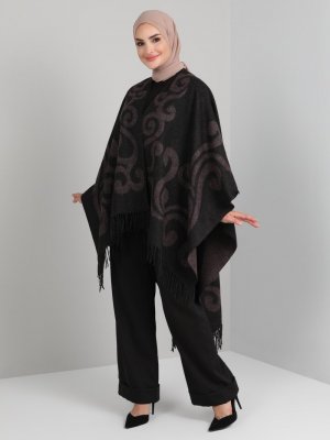 Tavin Mor Siyah Çift Yönlü Püsküllü Panço