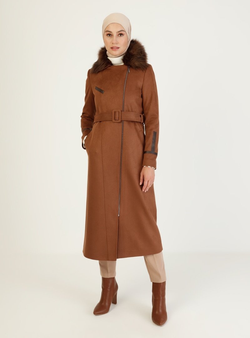 Olcay Taba Kürk Detaylı Boydan Fermuarlı Kap