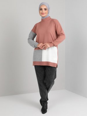 Tavin Gül Kurusu Gri Color Blok Boğazlı Yaka Triko Tunik