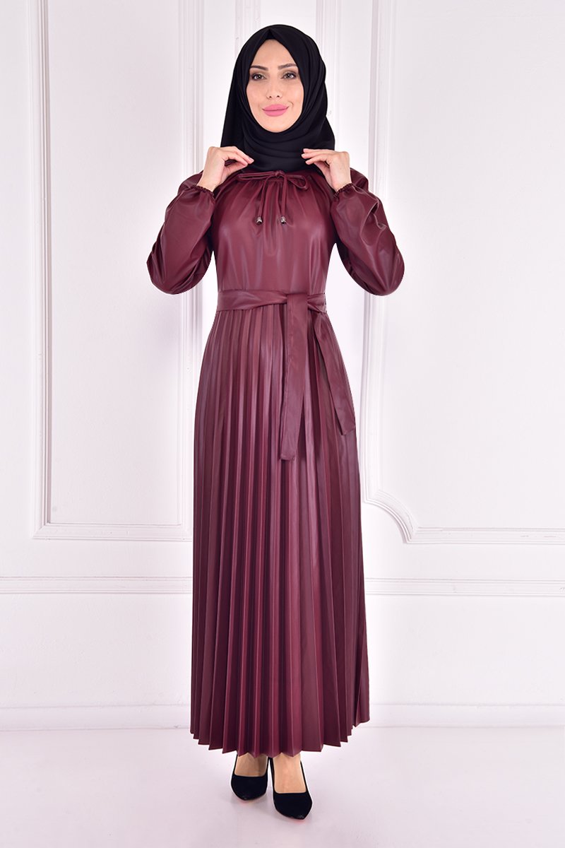 Moda Merve Bordo Deri Elbise