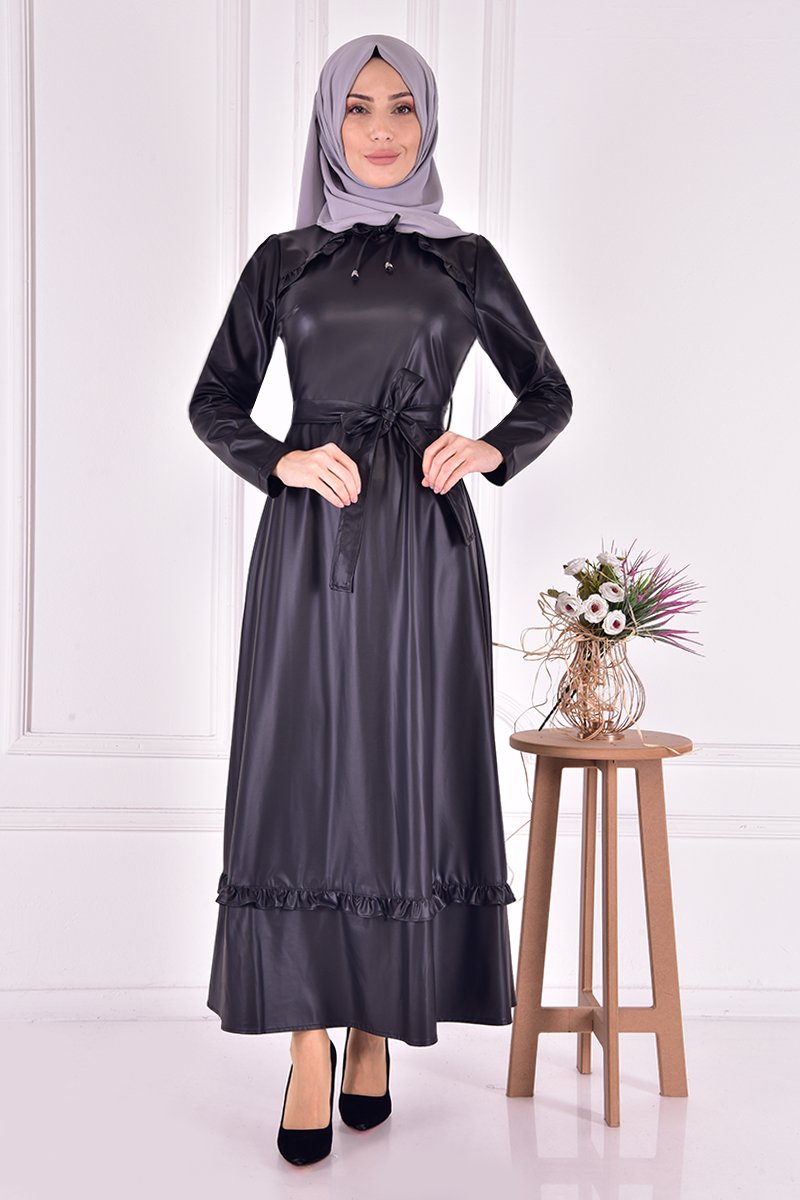 Moda Merve Siyah Deri Elbise