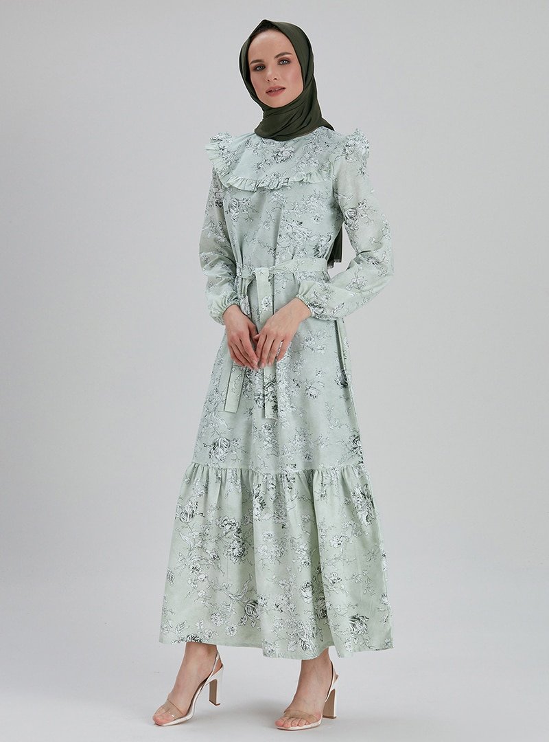 EBRAR Yeşil Beyaz Çiçek Desenli Elbise
