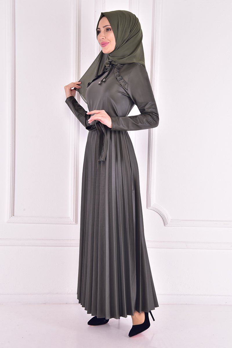 Moda Merve Haki Deri Elbise