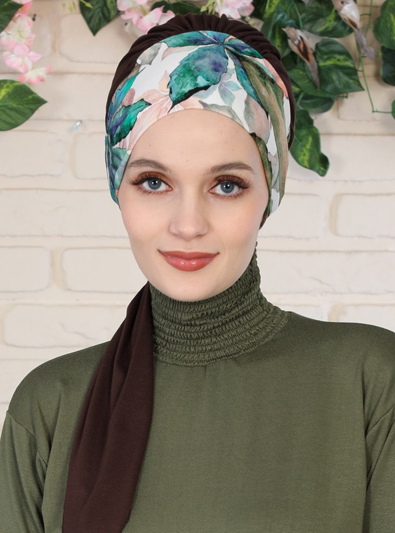 Ayşe Türban Tasarım Kahverengi Desenli Penye Hazır Türban