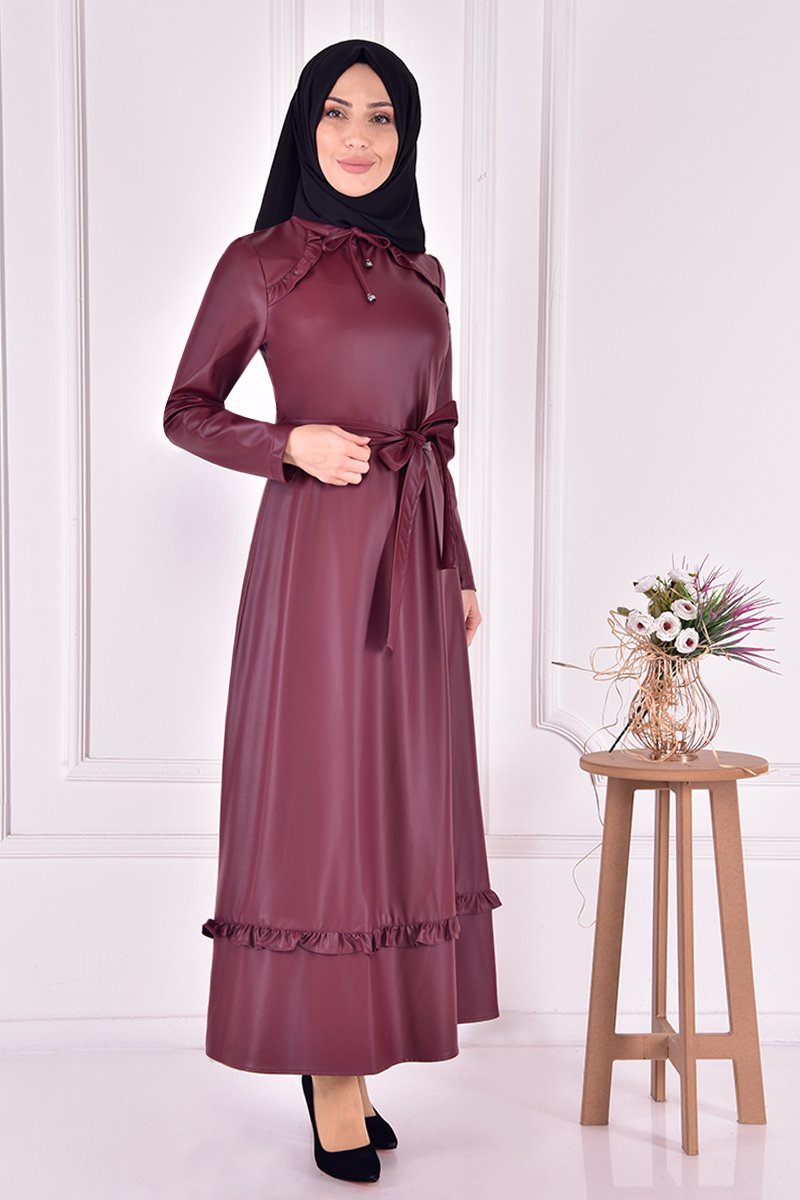 Moda Merve Bordo Deri Elbise