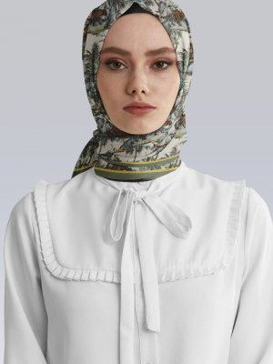 Modabutik Su Yeşili Krem Amazon Desenli Saten Eşarp