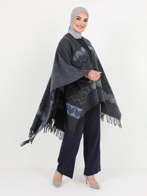 Tavin Mavi Lacivert Çift Yönlü Püskül Detaylı Desenli Panço