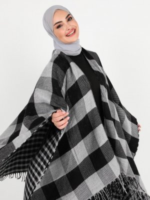 Tavin Siyah Çift Yönlü Ekoseli Püsküllü Panço