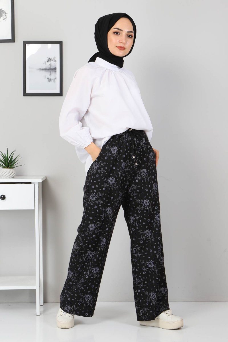MISSVALLE Siyah Beli Lastikli Çiçekli Pantolon