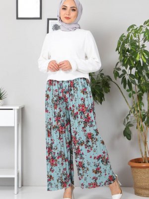 MISSVALLE Mint Çiçekli Piliseli Pantolon