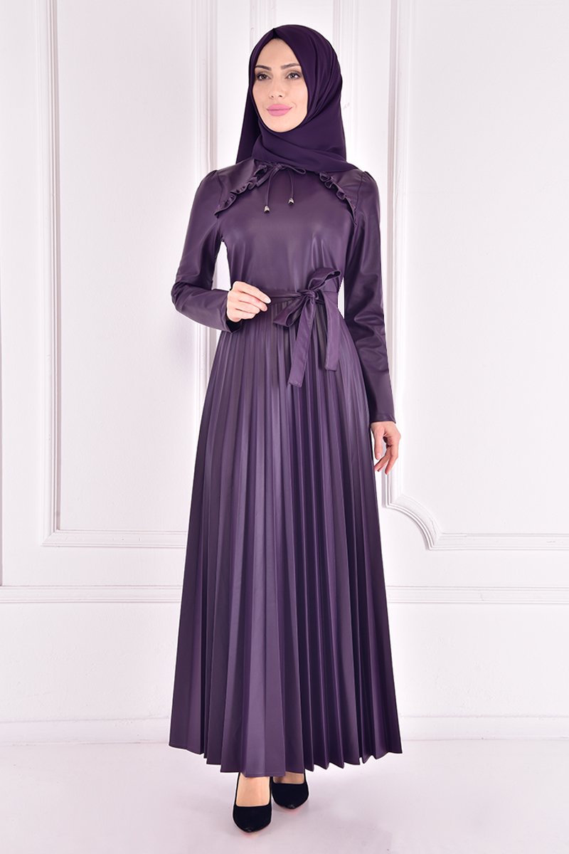 Moda Merve Mor Deri Elbise