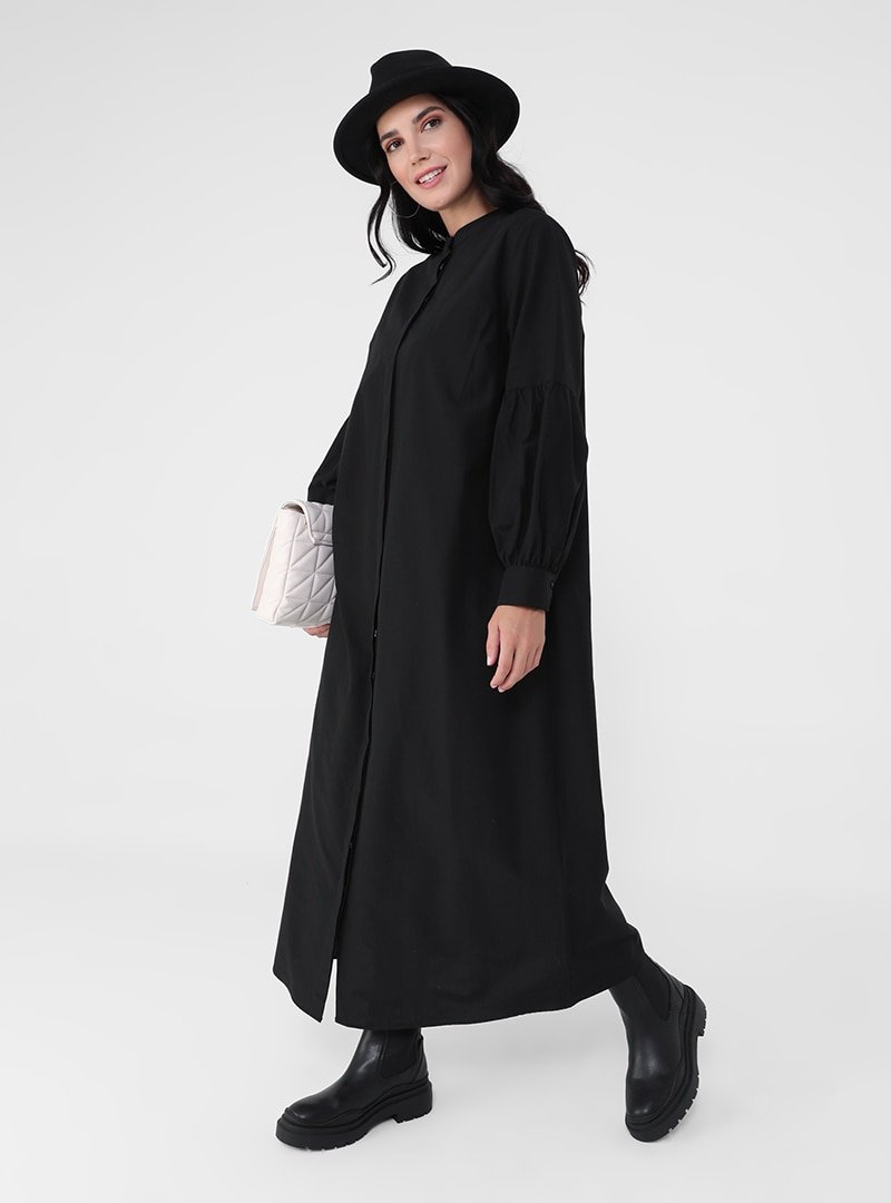 Alia Siyah Büyük Beden Pamuk Karışımlı Gizli Düğmeli Elbise