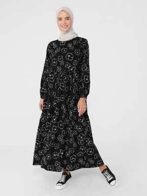 Benin Siyah Doğal Kumaşlı Çiçek Desenli Elbise