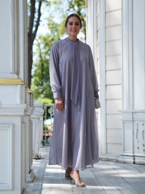 Alia Gri Büyük Beden Yakası Bağlamalı Abiye Elbise