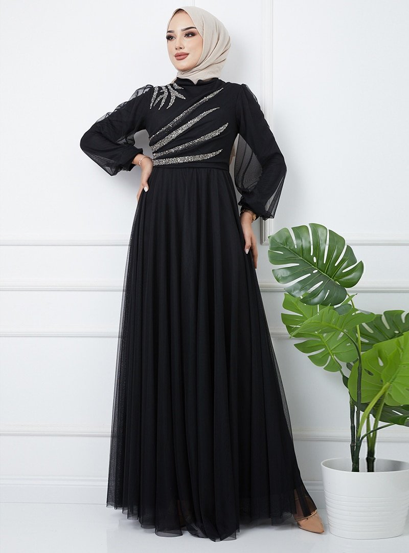 Olcay Siyah Önü Volan Ve Taş Detaylı Tüllü Abiye Elbise