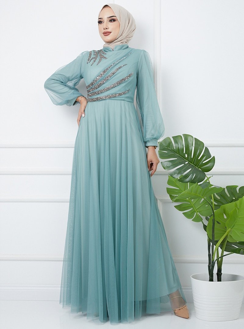 Olcay Mint Önü Volan Ve Taş Detaylı Tüllü Abiye Elbise