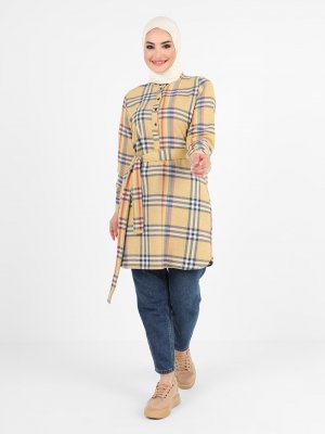 Tavin Safran Doğal Kumaşlı Ekose Desenli Tunik