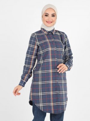 Tavin İndigo Doğal Kumaşlı Ekose Desenli Tunik