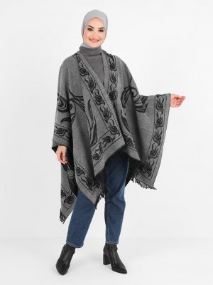 Tavin Siyah Gri Lale Desenli Püskül Detaylı Çift Yönlü Panço