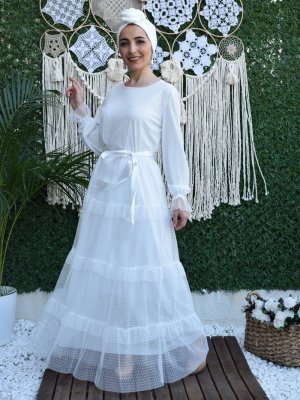 MAS&DESİGN Ekru Fırfırlı Saten Kemerli Abiye Elbise