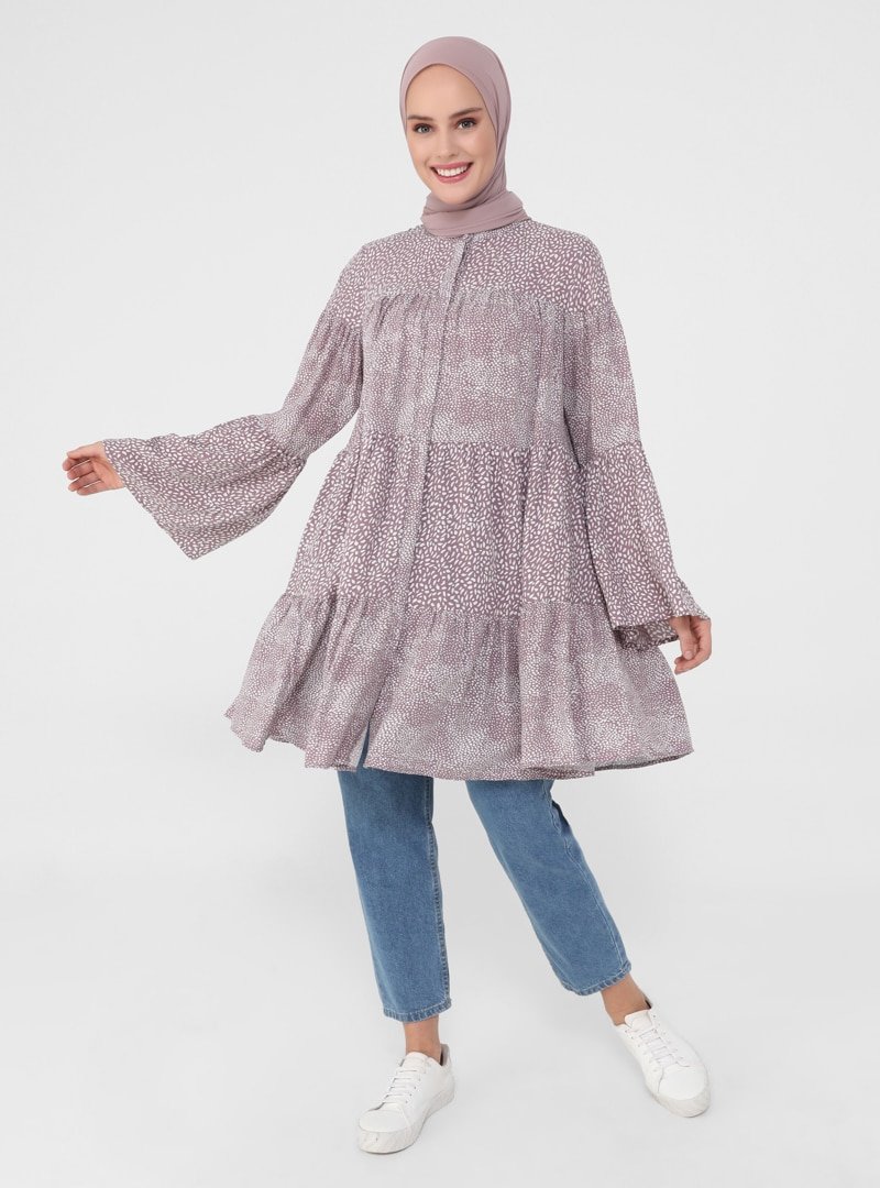 Refka Derin Pembe İspanyol Kol Çift Desenli Viskon Tunik