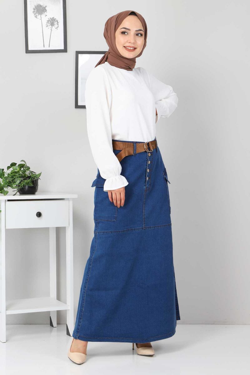 Tesettür Dünyası Mavi Yanları Cepli Kot Etek