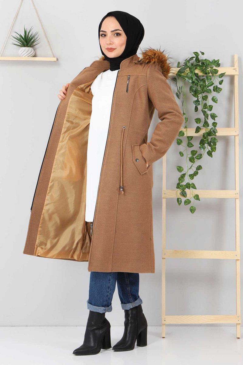 Tesettür Dünyası Süs Fermuarlı Kaşe Kaban Vizon