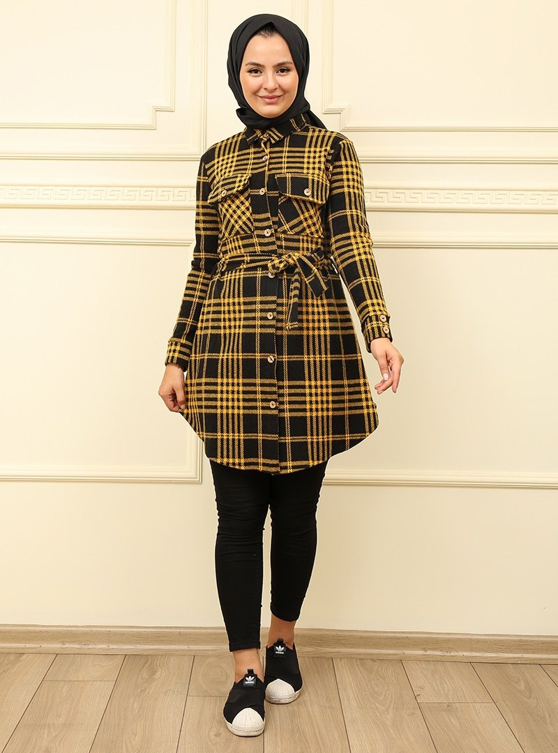 Moda Dua Hardal Kemerli Önden Düğmeli Kap