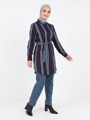 Tavin İndigo Doğal Kumaşlı Çizgili Tunik