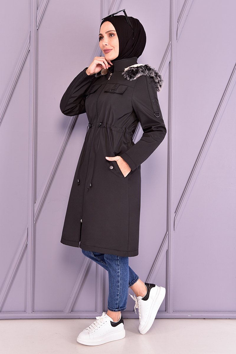 Moda Merve Siyah Kapüşonlu Kaban