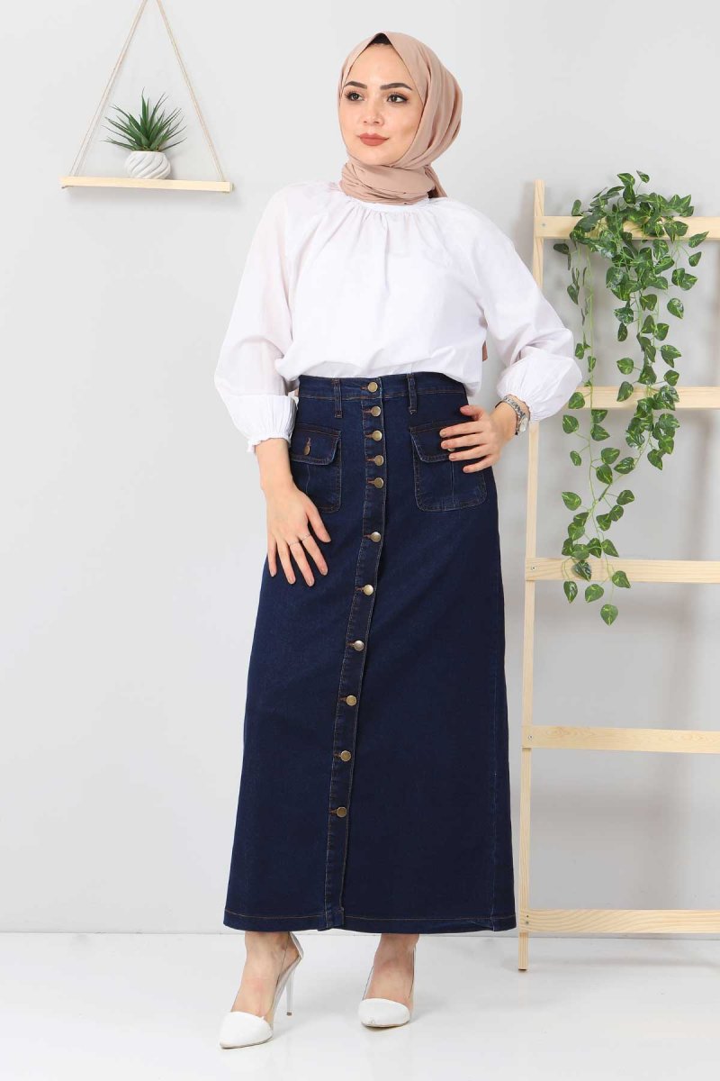 Tesettür Dünyası Mavi Önden Çakım Düğmeli Kot Etek