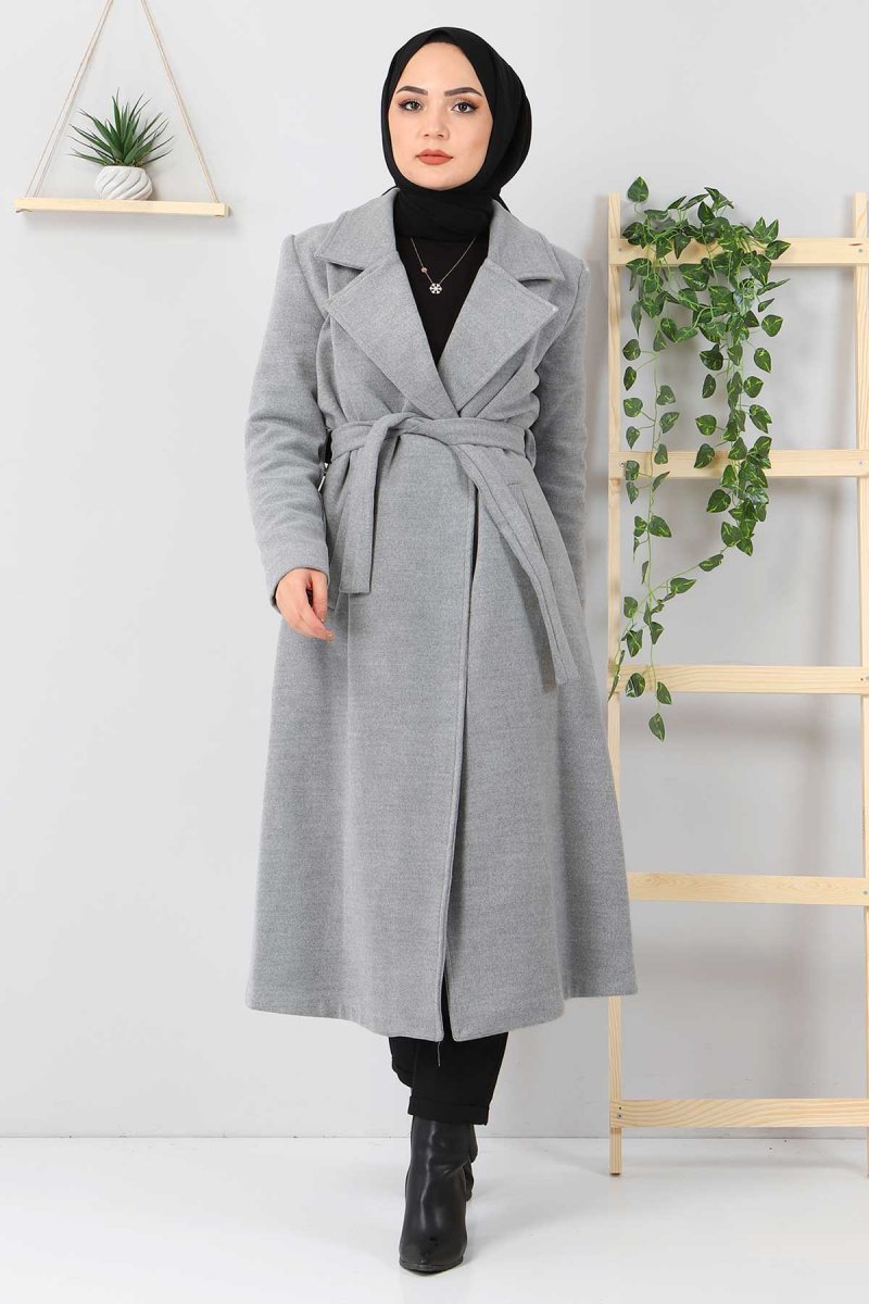 Tesettür Dünyası Gri Beli Kuşaklı Kaşe Kaban